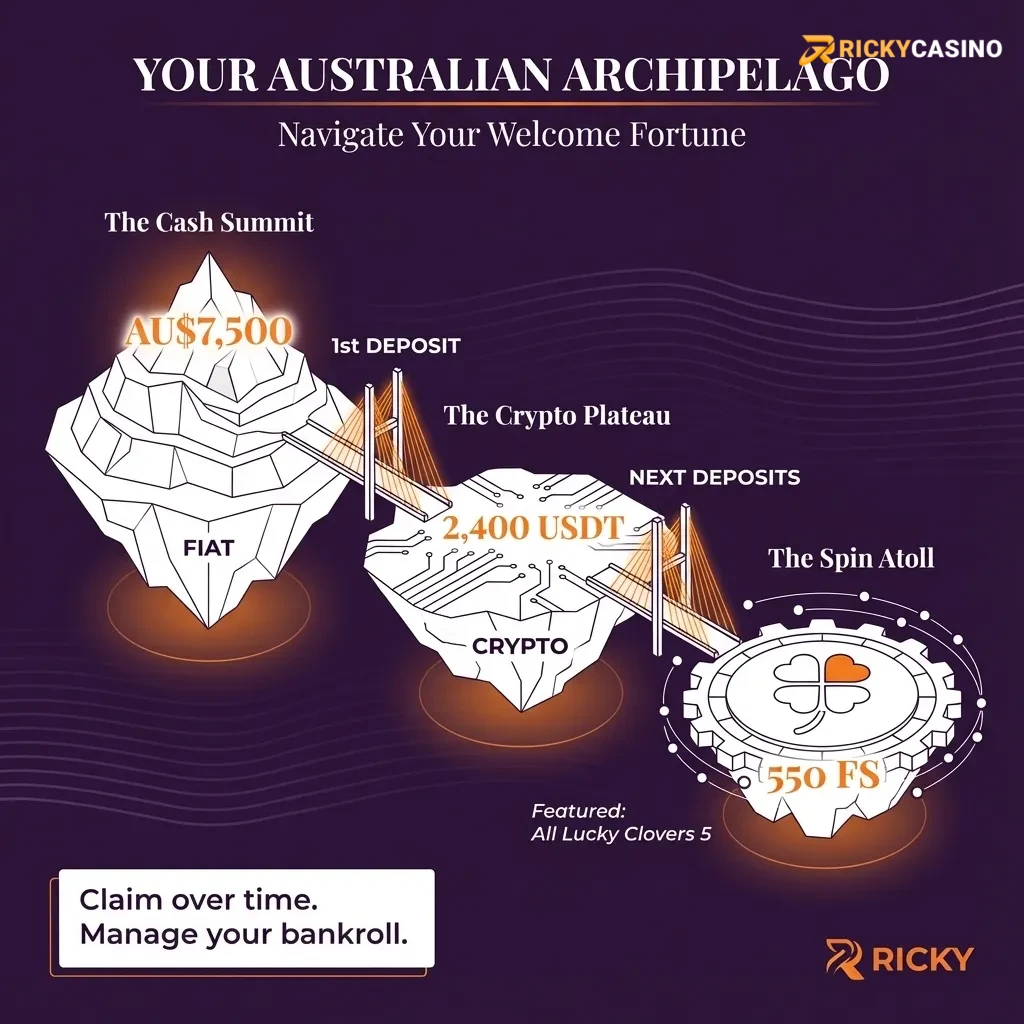 As a new player, you can claim up to AU$7,500 or 2,400 USDT plus 550 free spins on the All Lucky Clovers 5 slot. The package is split across several deposits so you can pace your play. Each step has a set percentage, minimum deposit, wagering, and time limit.